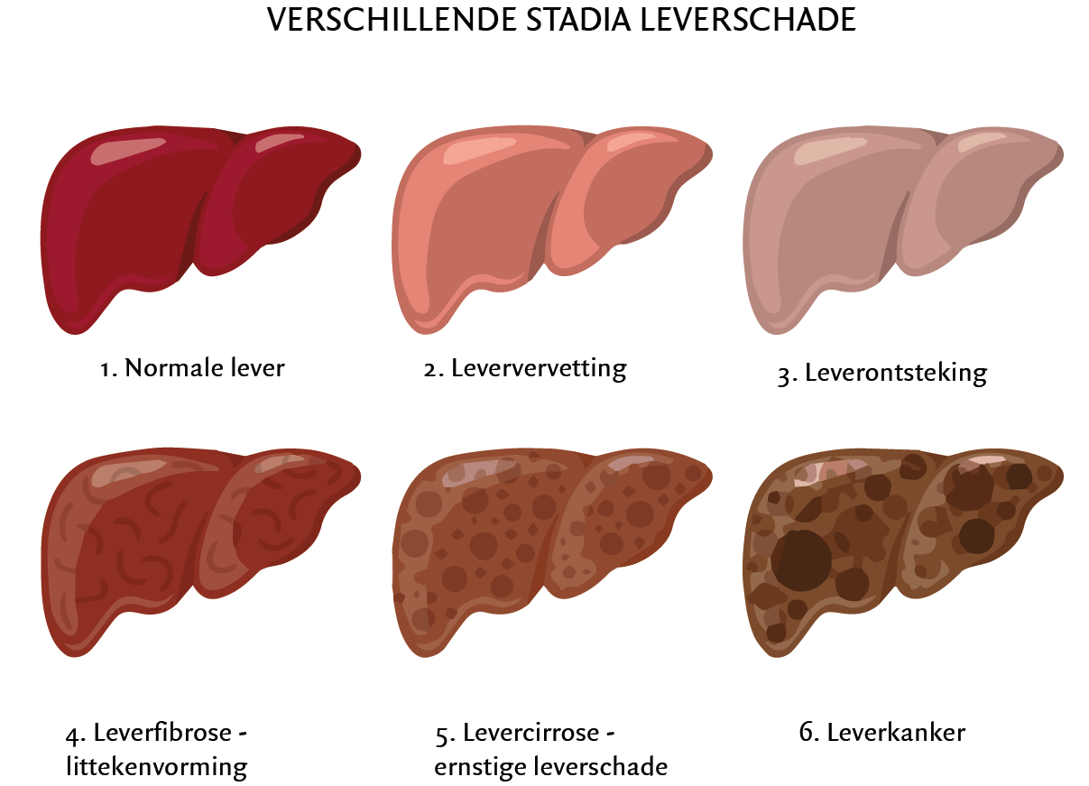Verschillende stadia van de aantasting van de lever door alcoholgebruik. Bron: Trimbos-instituut © Stichting Biowetenschappen en Maatschappij