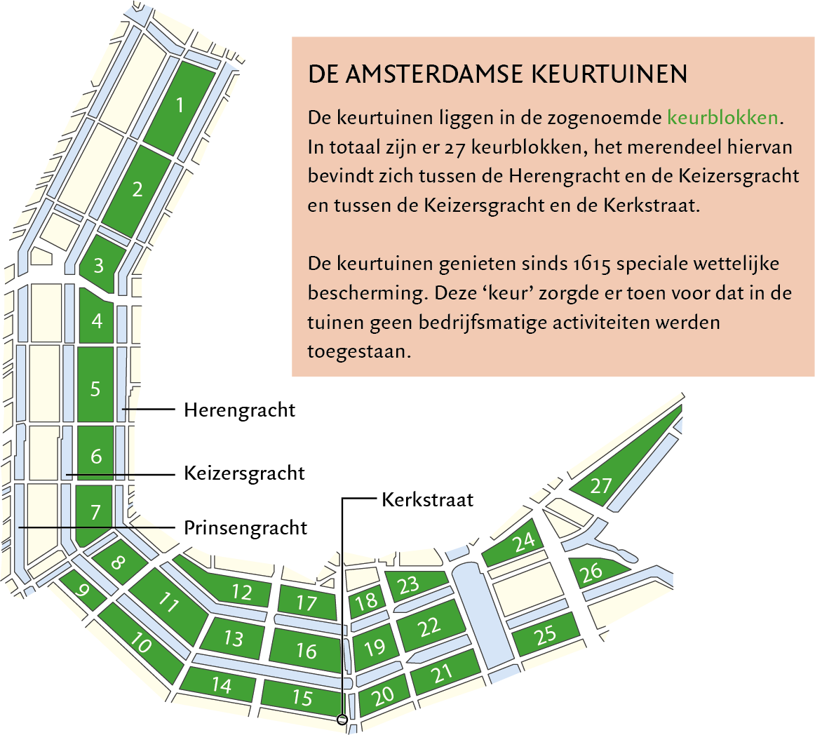 De bomen werden er niet alleen om esthetische redenen geplant, ook om praktische redenen. Ze droegen bij aan de stevigheid van kades, brachten verkoeling in de zomer, zuiverden de dikwijls verontreinigde stadslucht en waren destijds ook nog eens belangrijk voor de productie van hout en veevoer – hun takken en bladeren gingen naar de koeien, paarden en varkens in de stad. Ook bijzonder was dat achter de Amsterdamse grachtenpanden grote privétuinen werden aangelegd met een vaak exotisch beplantingsassortiment en vormgeving, een uiting van uitbundig ruimtelijk vertoon en rijkdom. Voor deze zogenoemde keurtuinen stelden het stadsbestuur stringente regels en bouwvoorschriften vast, de zogenoemde ‘keuren’. Die zijn vergelijkbaar met hedendaagse bouwbesluiten en omgevingsplannen, en gelden nog steeds.