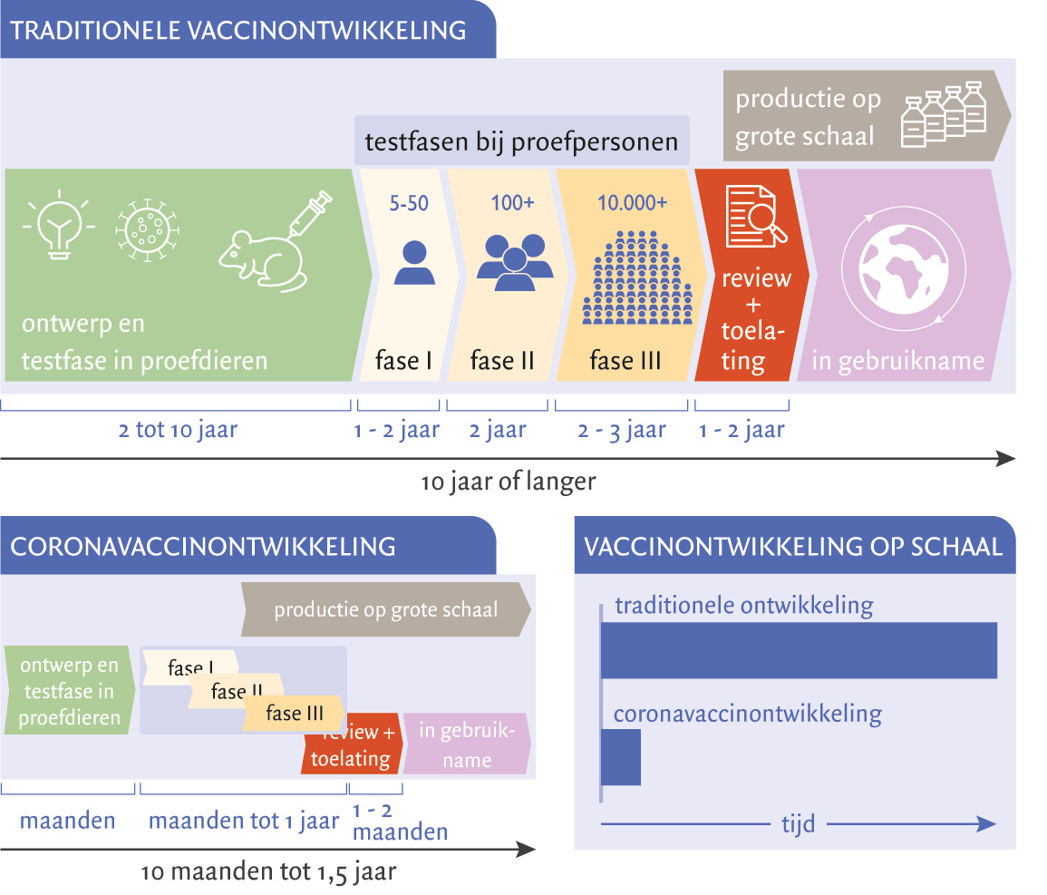 Onderzoeksfasen bij de ontwikkeling en productie van vaccins, en de tijdwinst bij de ontwikkeling van coronavaccins. Na de testfase in proefdieren wordt een kansrijk vaccin getest in proefpersonen. In testfase I zijn dit een tiental gezonde volwassen vrijwilligers om te bepalen of het vaccin veilig is en of het een afweerreactie opwekt. In testfase II zijn het een honderdtal proefpersonen uit de doelgroep om de optimale dosering te bepalen. In de laatste fase III zijn het meer dan tienduizend deelnemers om de werkzaamheid, de bescherming tegen ziekte en de veiligheid te bepalen door het aantal coronagevallen (met gedefinieerde klachten en aantoonbaar virus) en het optreden van bijwerkingen te vergelijken tussen een grote groep gevaccineerden en een controlegroep van ongevaccineerden. Gegevens uit alle testfasen en uit het productieproces worden beoordeeld voordat het vaccin tot de markt kan worden toegelaten. Vaccins halen die eindstreep echter lang niet altijd. © Stichting BWM