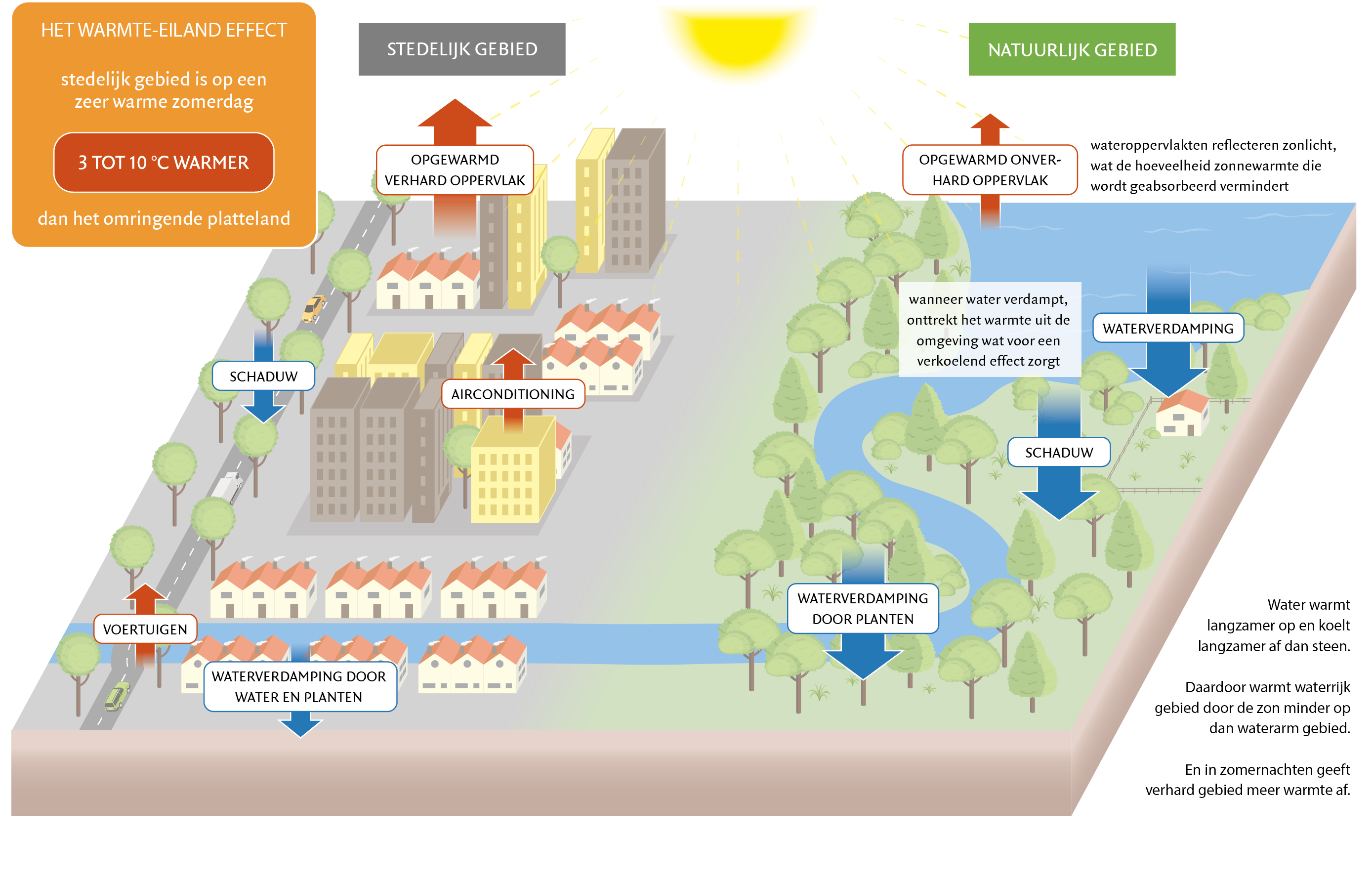 Warmte eiland. Steden zijn warmer dan de landelijke gebieden eromheen. Dit komt door het warme-eilandeffect. © Stichting BWM
