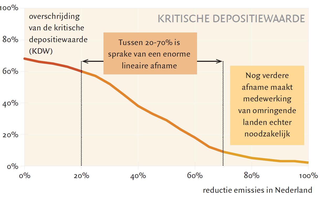 Vooralsnog is hier geen harde informatie over en kan de benodigde reductie dus niet worden berekend. Wel laten herstelmaatregelen tot nu toe zien dat het dweilen met de kraan open is en dat de depositie aanzienlijk moet worden gereduceerd om zelfs maar instandhouding te kunnen garanderen. Dan nog leidt ook een reductie van de depositie niet altijd tot direct herstel, maar kan het vanwege de opgehoopte stikstof in – en verzuring van – de bodem enige tijd duren voor de achteruitgang wordt omgebogen. De uitspraak ‘zo snel mogelijk’ is derhalve op dit moment toch het meest verantwoord.
