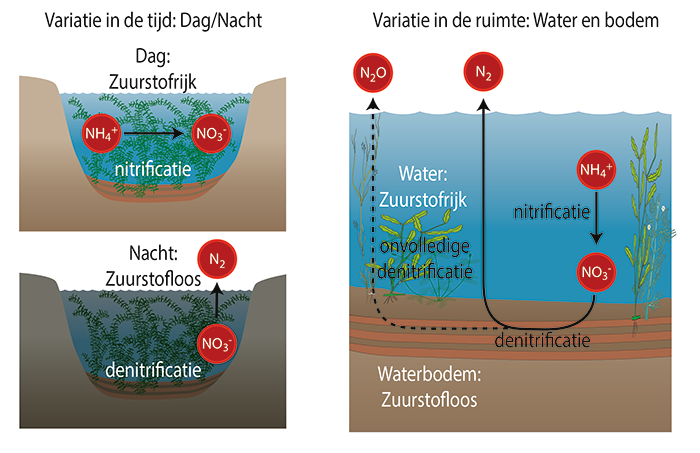 Gelukkig kunnen twee ecologische processen in waterbodems en op waterplanten dit reactieve stikstof weer uit het water verwijderen. Daarbij spelen micro-organismen de hoofdrol, met zuurstof als belangrijkste regisseur. In een waterkolom met veel zuurstof zetten bacteriën en archaea (vroeger bekend als oerbacteriën) ammonium namelijk om in nitraat, de zogenoemde nitrificatie. En dit nitraat transformeren weer andere bacteriën vervolgens in stikstofgas (N2), het meest voorkomende bestanddeel van lucht, dat nauwelijks reageert met andere stoffen (zie Stikken in de stikstof).