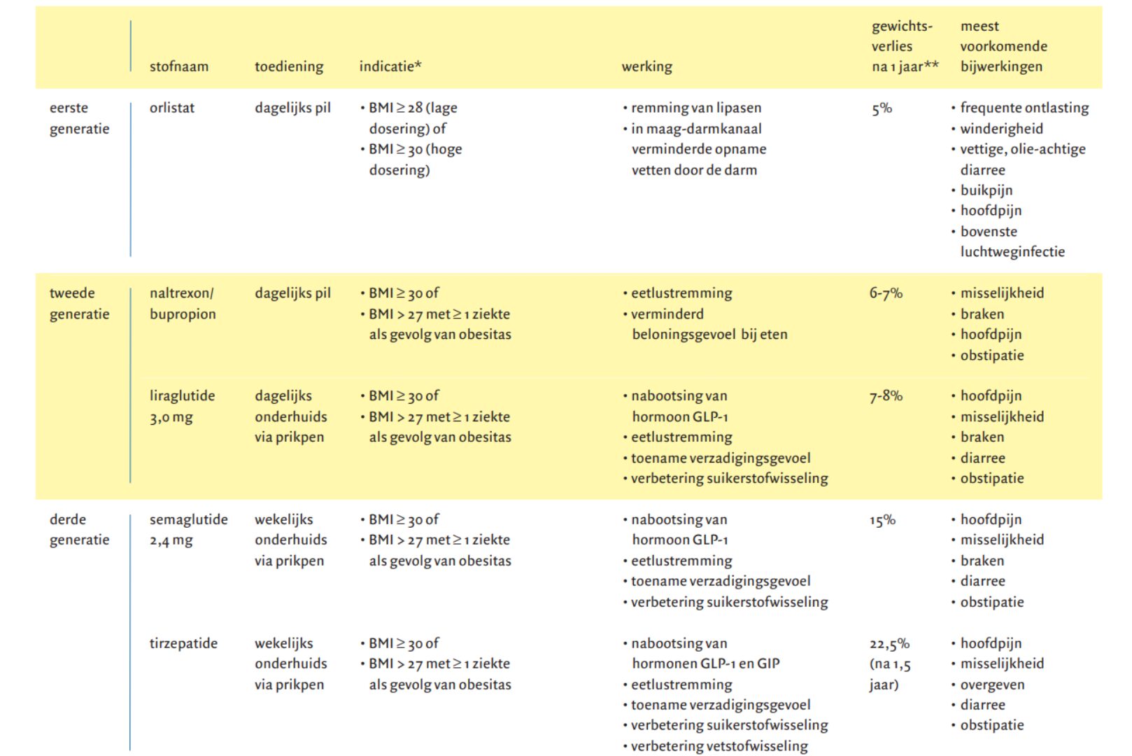De ontwikkeling van gewichtsreducerende medicijnen gaat in rap tempo door. Er is inmiddels een nieuwe generatie middelen met bijvoorbeeld semaglutide (ook wel bekend onder merknamen zoals Ozempic, Wegovy en Rybelsus), een langwerkende synthetische GLP-1-agonist die 1 keer per week wordt geïnjecteerd en na iets meer dan 1 jaar gemiddeld bijna 12,5 procent extra gewichtsverlies oplevert. Ook is tirzepatide (Mounjaro en Zepbound) beschikbaar gekomen, een tweevoudig werkend middel dat naast GLP-1 ook het darmhormoon glucose-dependent insulinotropic polypeptide (GIP) nabootst. Na ongeveer 1,5 jaar gebruik geeft tirzepatide een extra gewichtsverlies van bijna 18 procent.