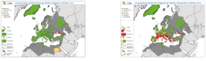 De huidige bekende verspreiding van de gelekoortsmug en de Aziatische tijgermug in Europa (oktober 2021). Bron: ECDC/EFSA
