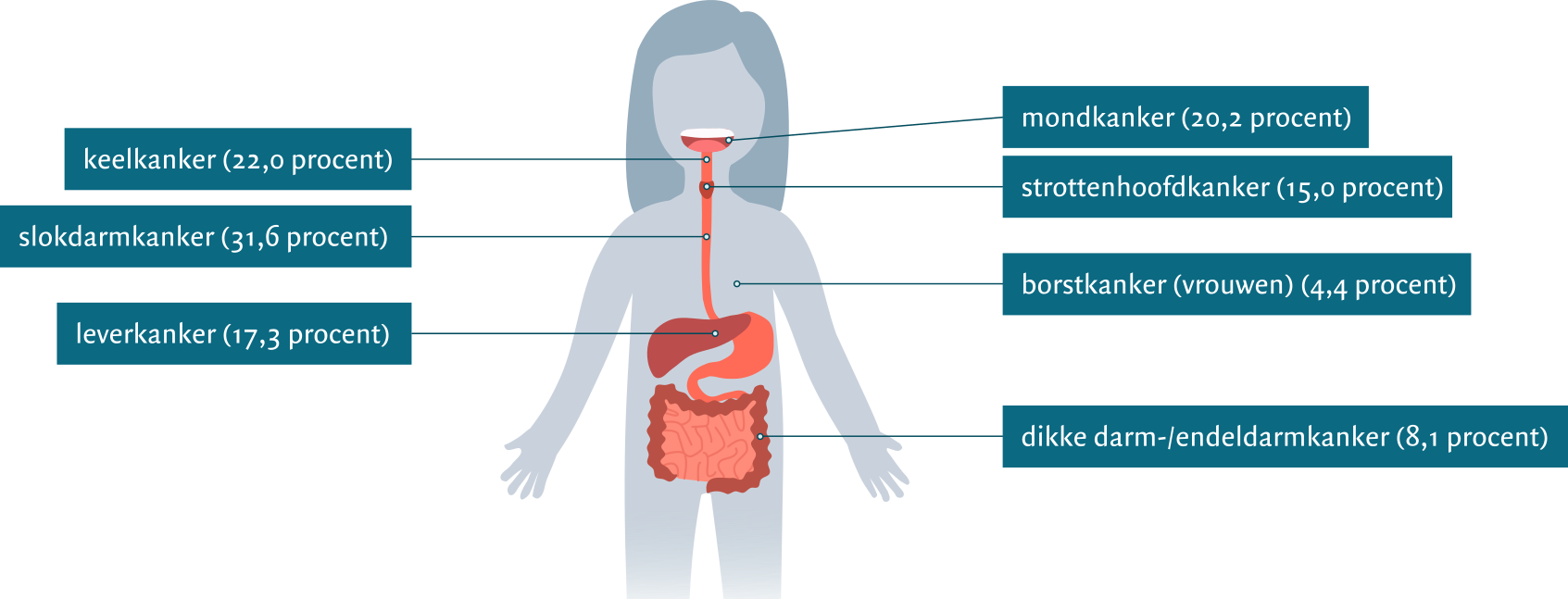 Percentage kankergevallen veroorzaakt door alcohol. (Bron: Trimbos/Alcoholinfo.nl)