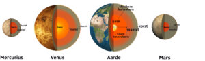 De overeenkomsten en verschillen tussen de binnensten van de vier aardse planeten (bron: NASA/Wikipedia, bewerking Inge Loes ten Kate).