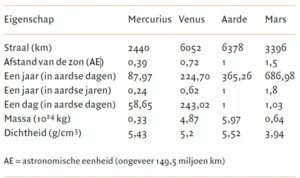 In de tabel is een aantal eigenschappen van de aardse planeten naast elkaar gezet. Wat opvalt is dat Mercurius, Venus, Aarde en Mars behoorlijk verschillen, ondanks dat ze allemaal aards zijn. Mercurius en Mars zijn veel kleiner dan Venus en Aarde. De tijdsduur van een rondje om de zon – voor Aarde een jaar – is afhankelijk van de afstand tot de zon. Als we de lengte van een dag – de tijd die het kost om een rondje om de eigen as te draaien – bekijken, zien we dat Aarde en Mars ongeveer even snel om hun as draaien, maar blijkt een dag op Mercurius bijna drie aardse maanden te duren en op Venus wel acht aardse maanden. De zwaartekracht van de zon heeft de draaisnelheden van Mercurius en Venus ontzettend vertraagd. De draaisnelheid hangt dus niet af van de grootte van de planeet, maar van de afstand tot de zon. De grootte van een planeet wordt onder andere bepaald door de hoeveelheid materiaal die beschikbaar was op de plaats waar de planeet ontstond, maar ook bijvoorbeeld een gigantische botsing kan nog invloed hebben.