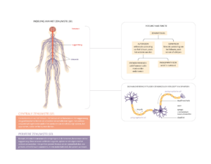 [Figuur 1] Het zenuwstelsel is onder te verdelen in het perifere zenuwstelsel (de zenuwcellen met uitlopers) en het centrale zenuwstelsel (het ruggenmerg en de hersenen). Een andere onderverdeling gaat uit van de werking en onderscheidt het animale zenuwstelsel (bewuste handelingen) en het autonome zenuwstelsel (onbewuste activiteiten zoals het regelen van de bloeddruk, hartslag, ademhaling en zweetproductie). Het autonome zenuwstelsel kan dan weer worden onderverdeeld in het (ortho)sympathische zenuwstelsel (actiemodus) en het parasympathische zenuwstelsel (rust) (© Stichting BWM).