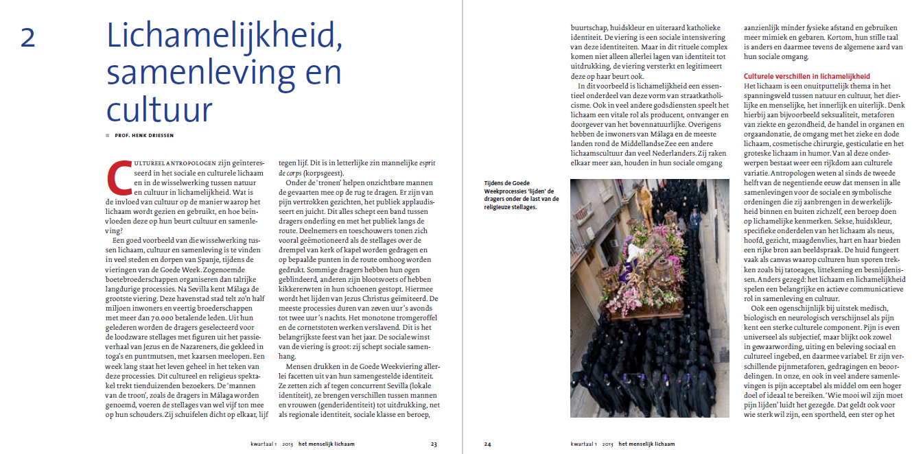 Het lichaam kun je door veel verschillende brillen bekijken. Dit cahier kijkt met een culturele blik naar het lichaam aan de hand van bijvoorbeeld de zelfkastijding van de Spaanse broederschappen tijdens de ‘Goede Weekprocessies’ en de tentoonstelling van ‘wilden’ als Saartje Baartman of de Ghanese koning Badu Bonsu.